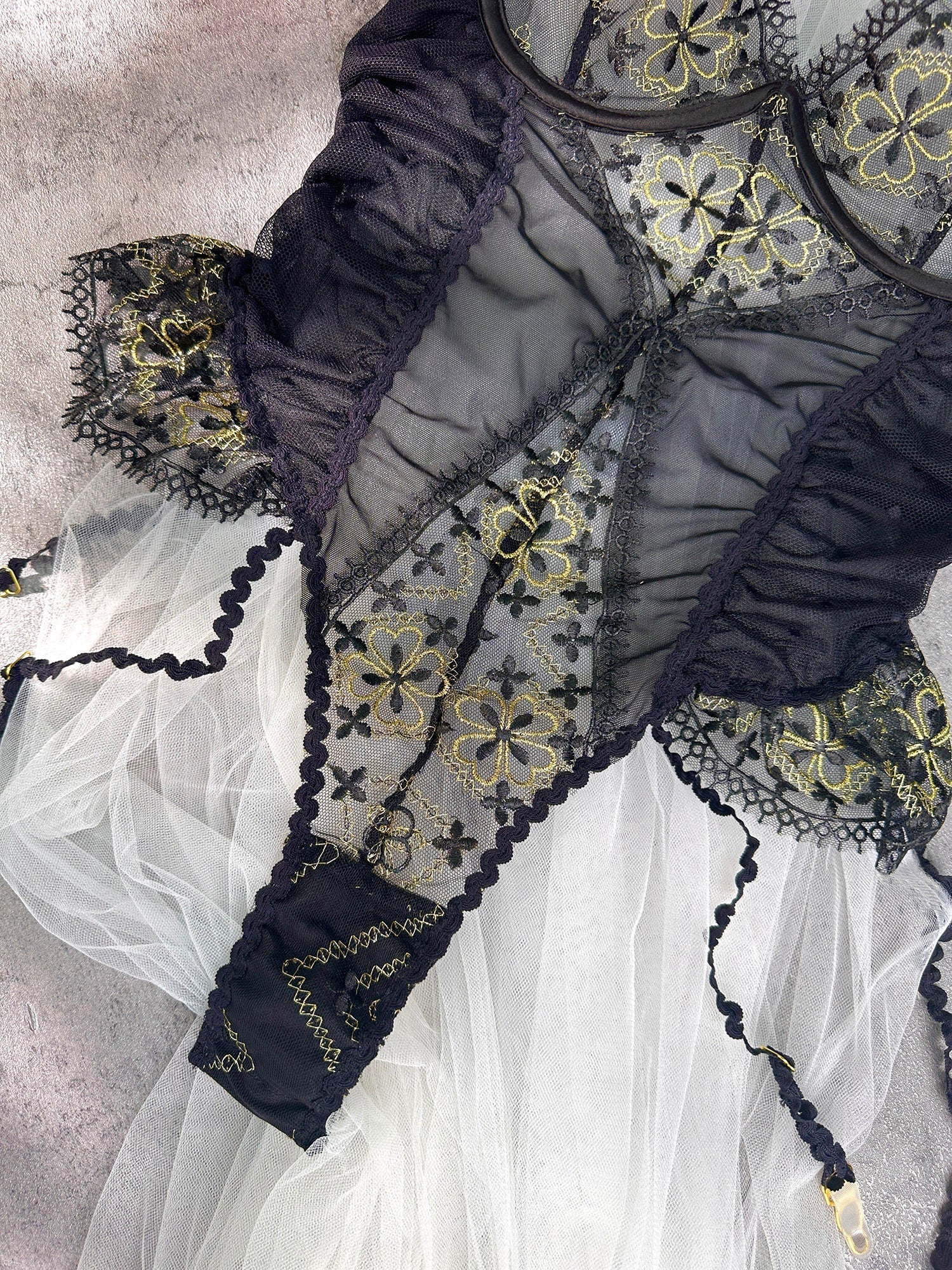 Turn heads in the Anastasia Midnight Gold Bodysuit — a stunning fusion of sheer black mesh and golden floral embroidery. The corset-style silhouette sculpts your shape with underwire support, while soft ruffled trims along the hips add a touch of romance.
