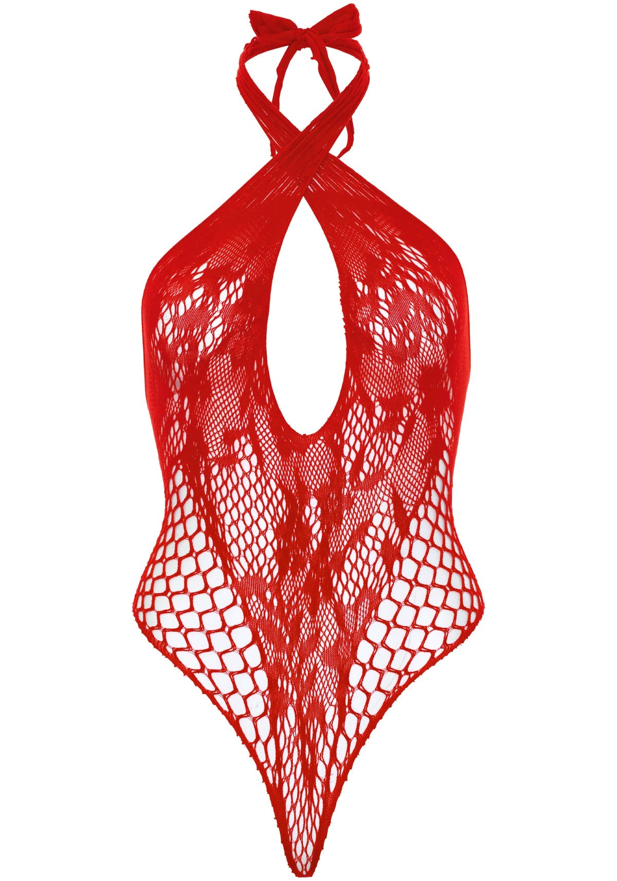 Make your move in this sultry lace lingerie teddy by Leg Avenue. A sexy pairing of steamy fishnet and stretch lace, this curve-hugging bodysuit features a cross over halter neck with a plunging keyhole detail and cheeky thong back for a look that’s irresistible.