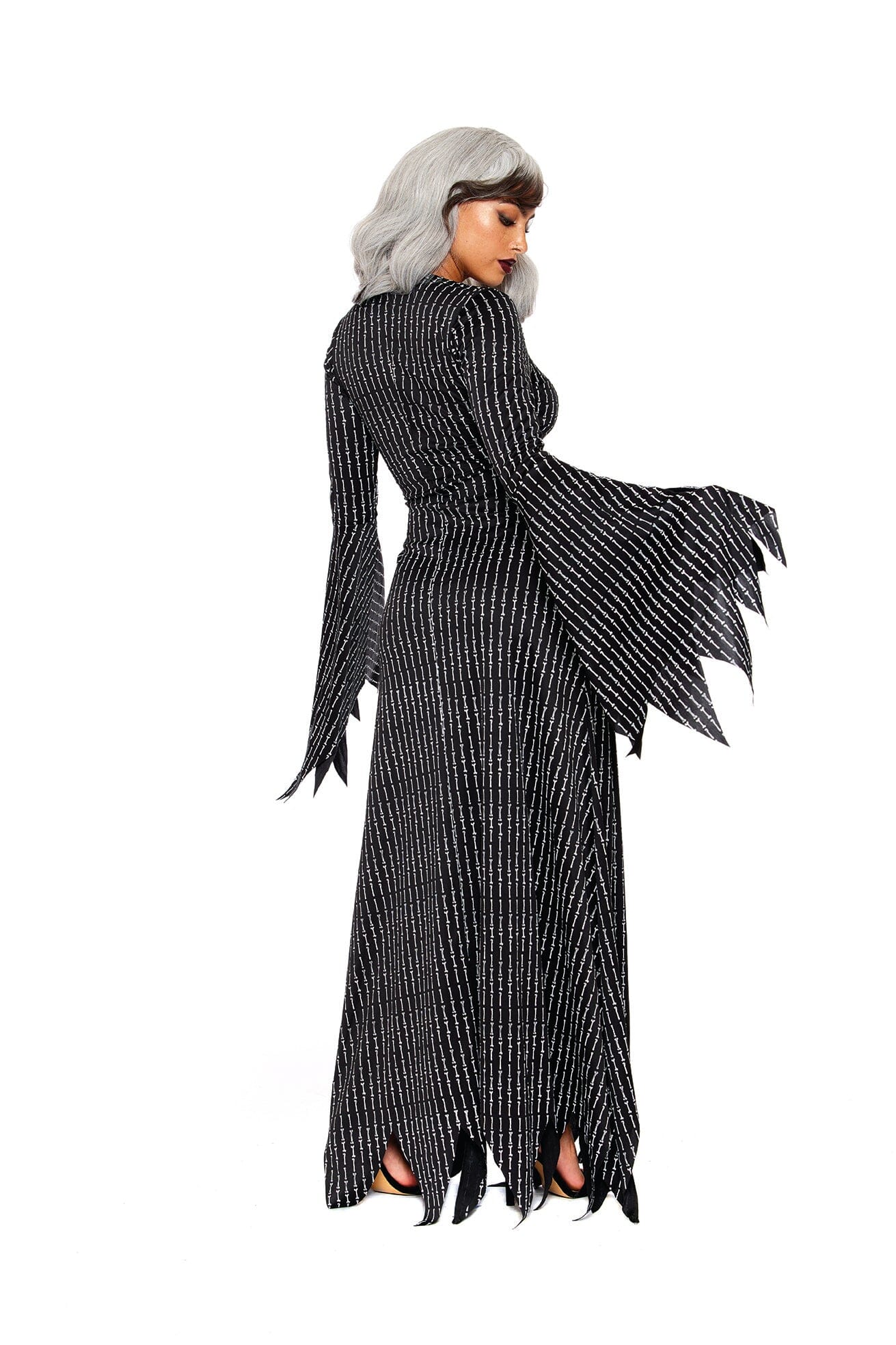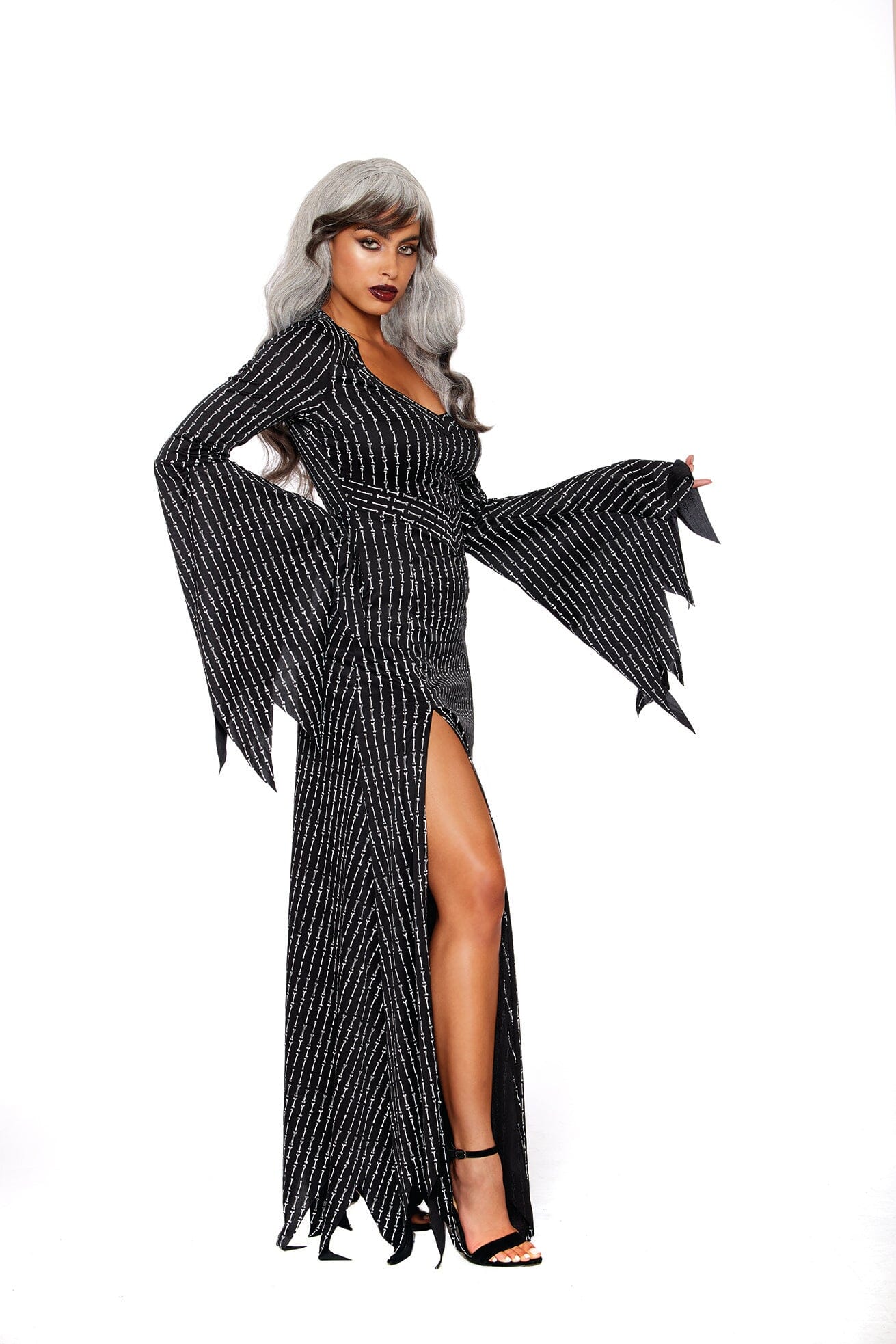 • ""Bone"" pinstripe printed slit dress with dagged bell sleeves and hem