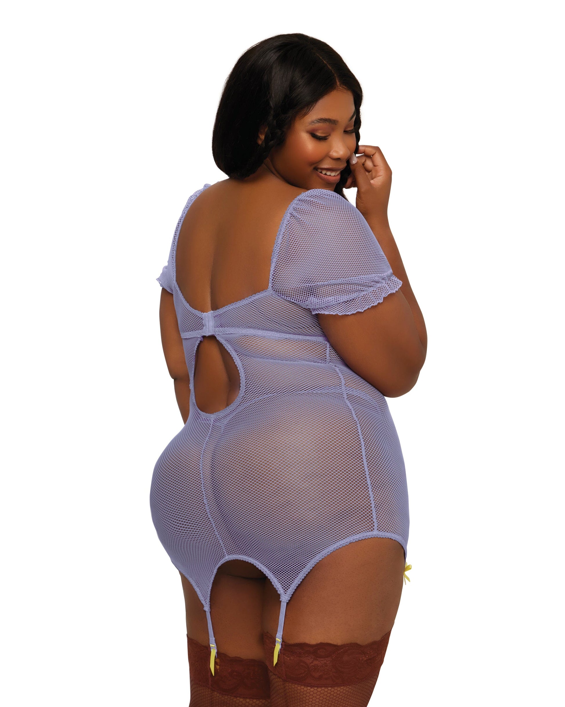 Dreamgirl Embroidered Eyelet Band and Stretch Fishnet Garter Slip and G-string Set