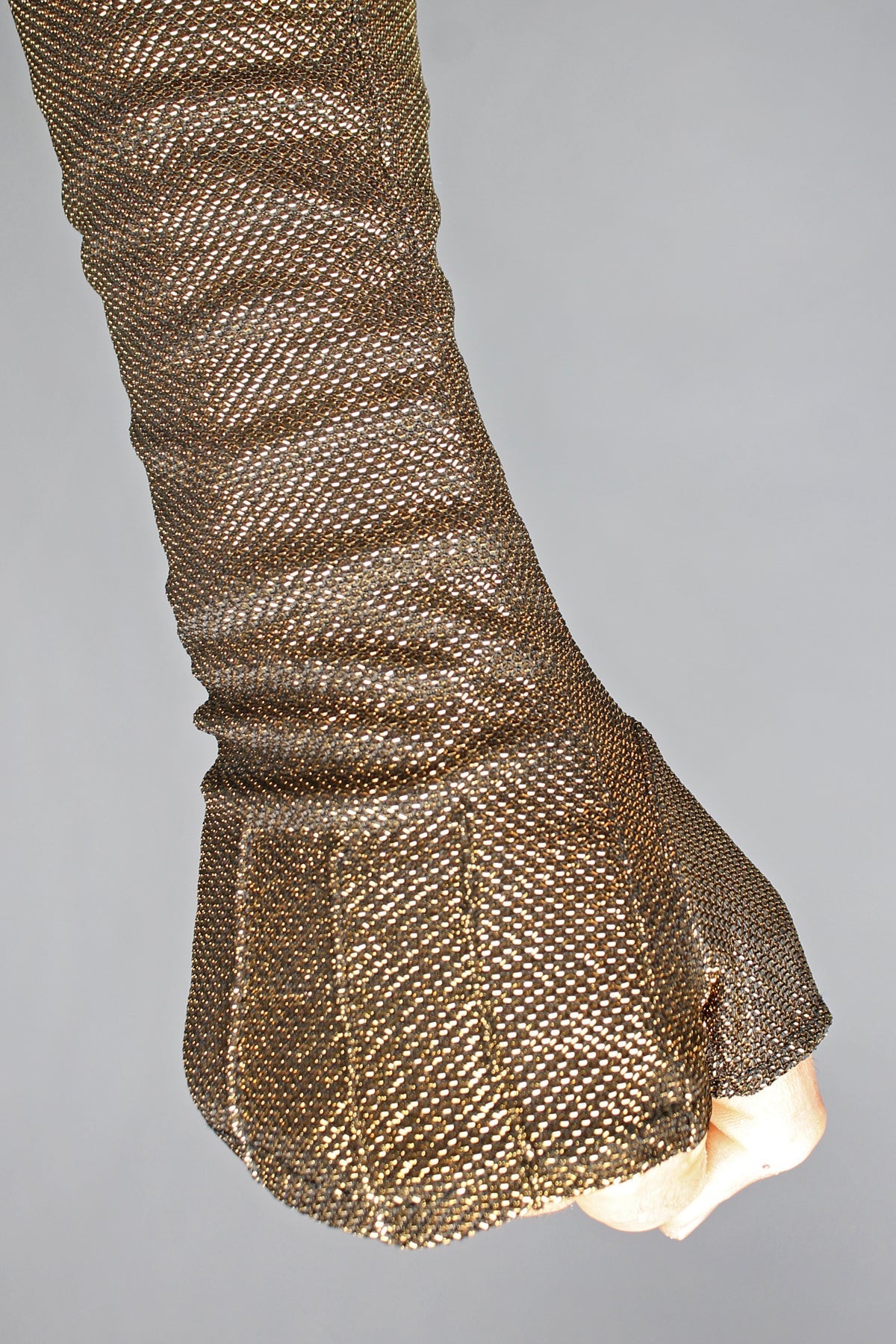 Elbow-length fingerless opera gloves in shimmering gold sparkle fabric that catches and reflects light with every movement. The stretchy material hugs your arms like glitter snakes, creating a mesmerizing shimmer effect that photographs can't quite capture. Features a thumb hole with one opening for all fingers, making them perfect for dancing, festivals, and any occasion where you want maximum arm impact. The dynamic sparkle intensifies under stage lights and on the dance floor, transforming your arms into a dazzling light show.
