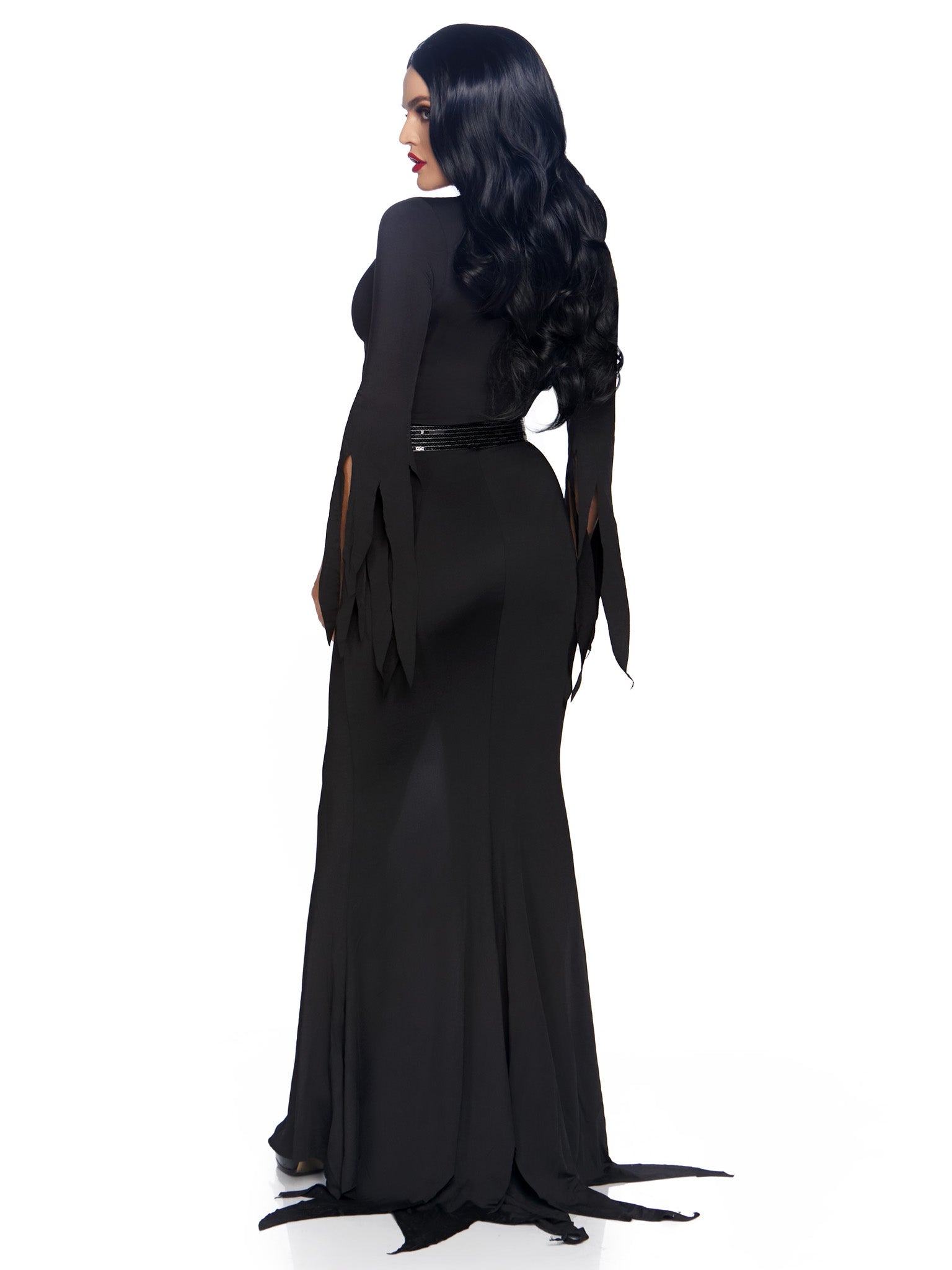 Enslave them, body and soul with the iconic Immortal Mistress Halloween costume by Leg Avenue. Sultry, elegant, and absolutely irresistible, this sexy Halloween costume is sure to take their breath away (literally). The 3 PC costume includes a deep-V body hugging dress with classic tentacle hem and tattered sleeves, sequin belt, and a spooky glitter bat necklace. Pair with your favorite heels and let your inner Morticia shine!