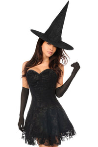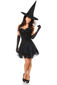 - Costume Includes: Corset Dress, Lace Witch Hat, Black Gloves