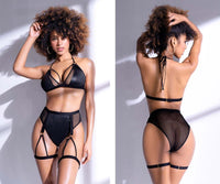 Play the game of seduction with this two-piece set in fishnet mesh and leather effect. Neck tie top and matching high waist panty with garters.
