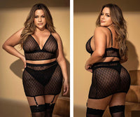 A glamorous three piece set in a contemporary geometric mesh. Includes triangle top with adjustable straps, matching thong and skirt with a garter belt.