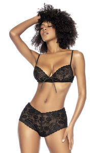 A flattering silhouette with a touch of luxury. Floral lace top with shiny lace details, matching cheeky with lace-up back design. Adjustable straps.