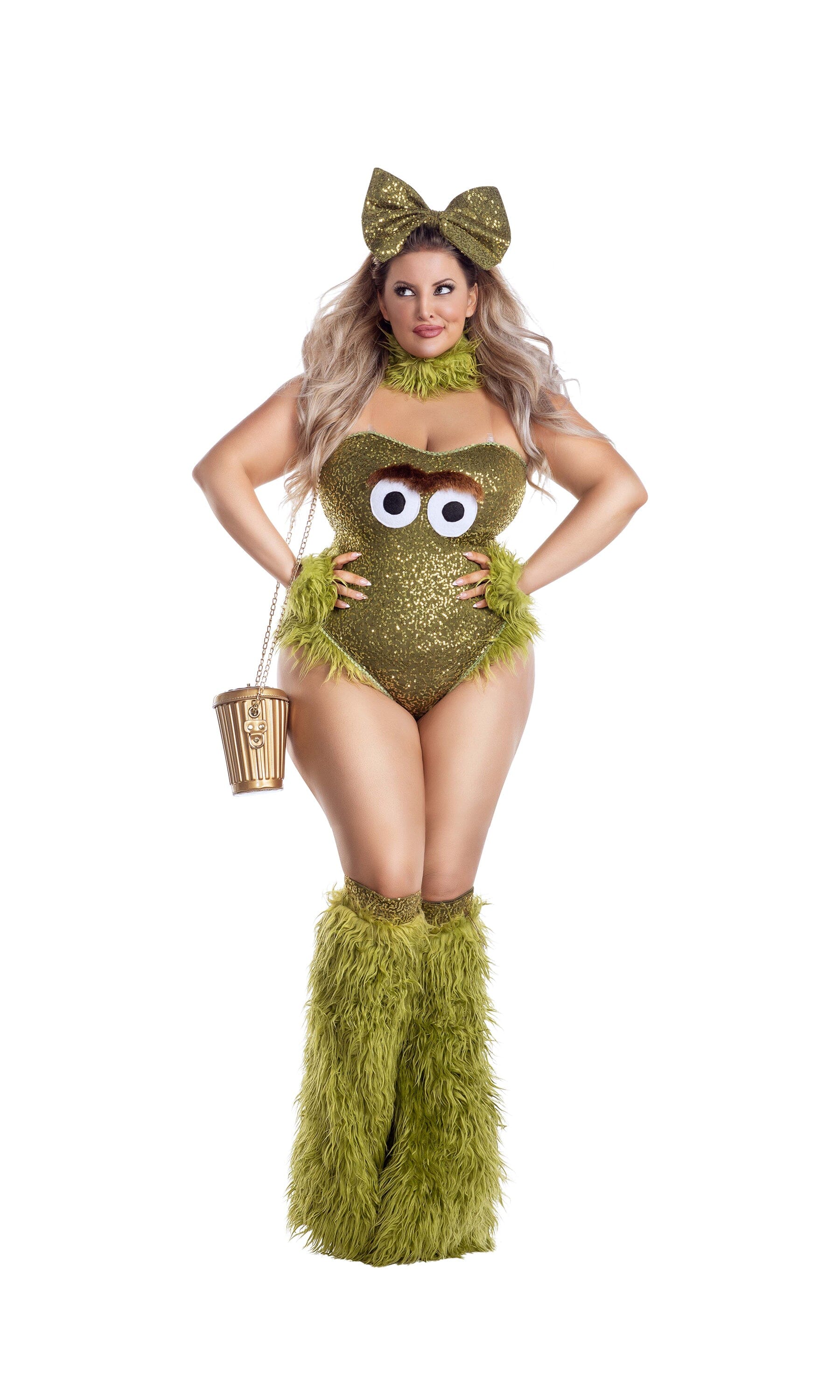 PLUS Cranky Creature green sequin teddy with green fur accents and eye details. Comes with matching furry leg warmers, headpiece, neckpiece, wristlets and trashcan purse.
