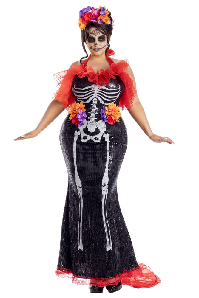 Black sequin “mermaid” dress with red ruffle train, off shoulder details, flower accents and skeleton print