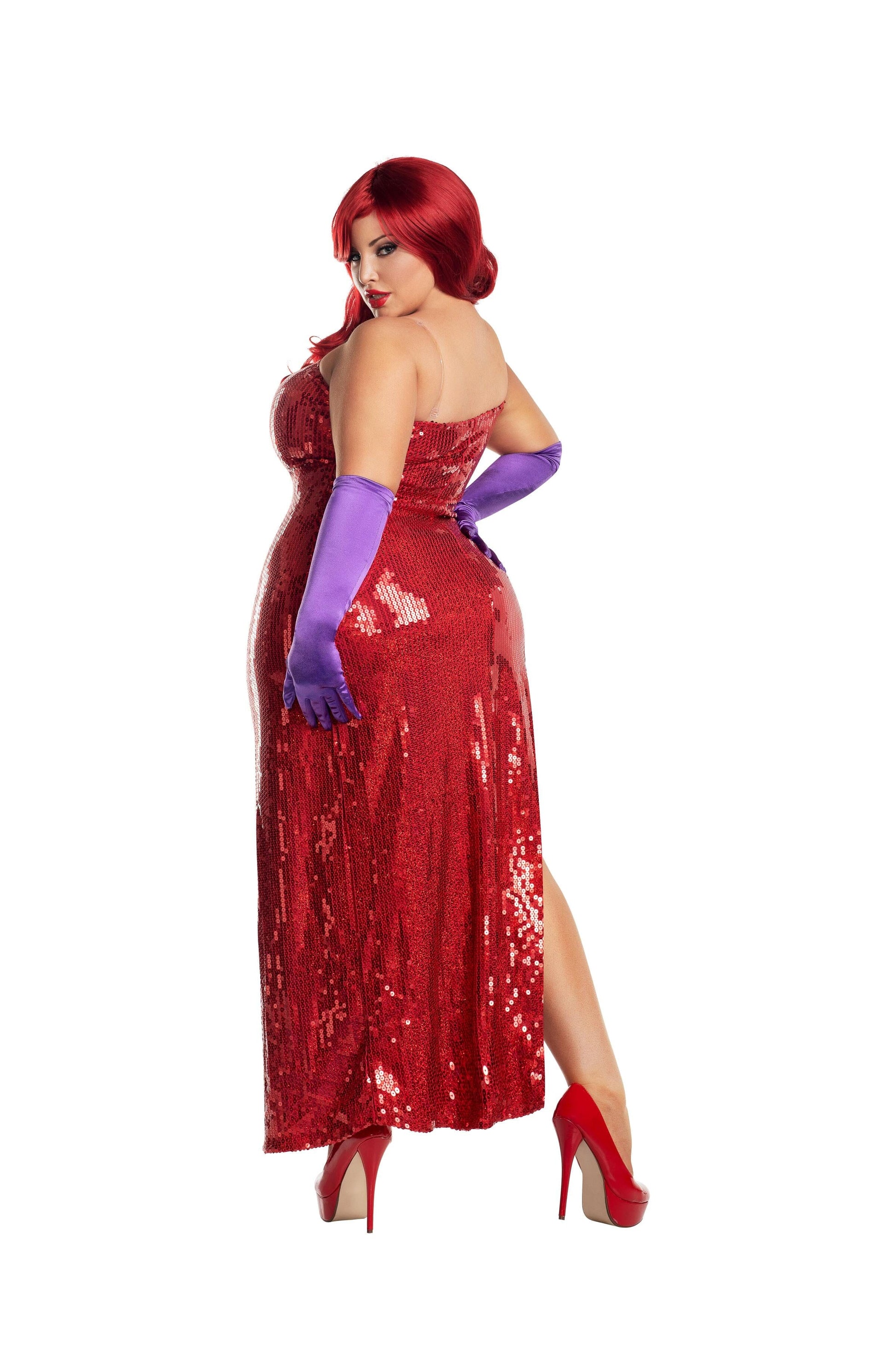 Red sequin dress with slide slit Comes with purple gloves