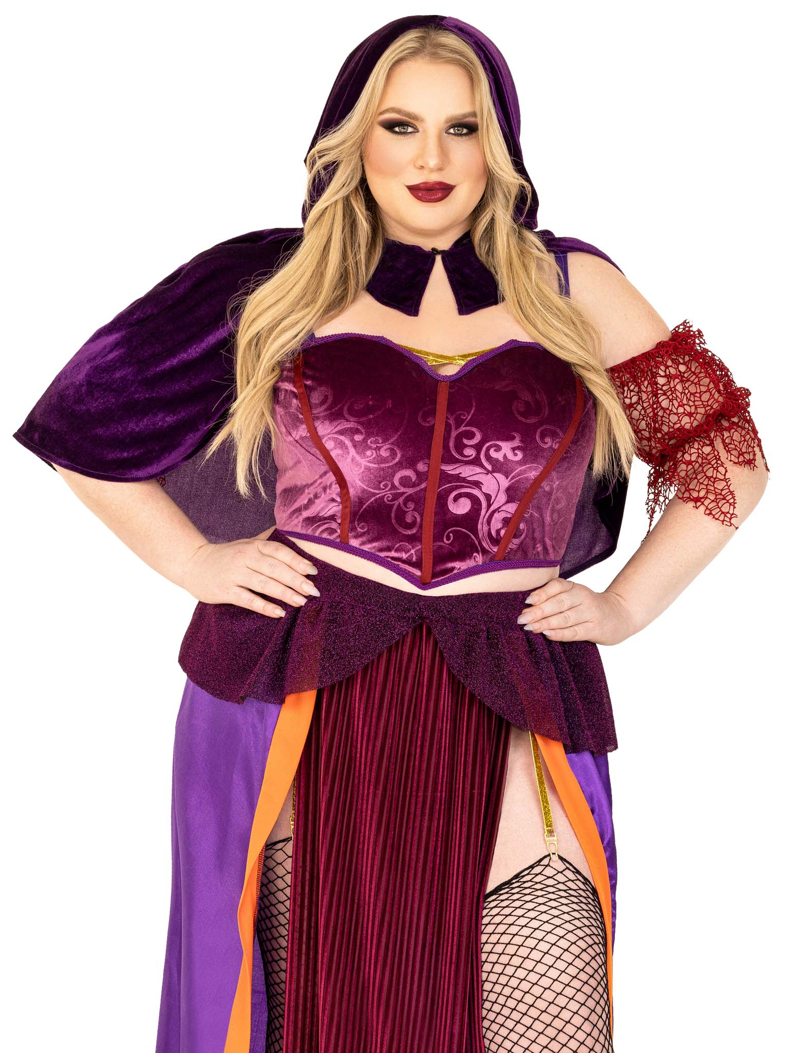 Unleash your inner magic in the sultry 3 Piece Black Magic Babe plus size Halloween costume by Leg Avenue. This womens sexy costume includes a velvet crop top with net sleeves, dual slit long skirt with glitter elastic garter, and matching collared caplet with pointed hood. Complete your witch costume by adding fishnet stockings, sold separately.