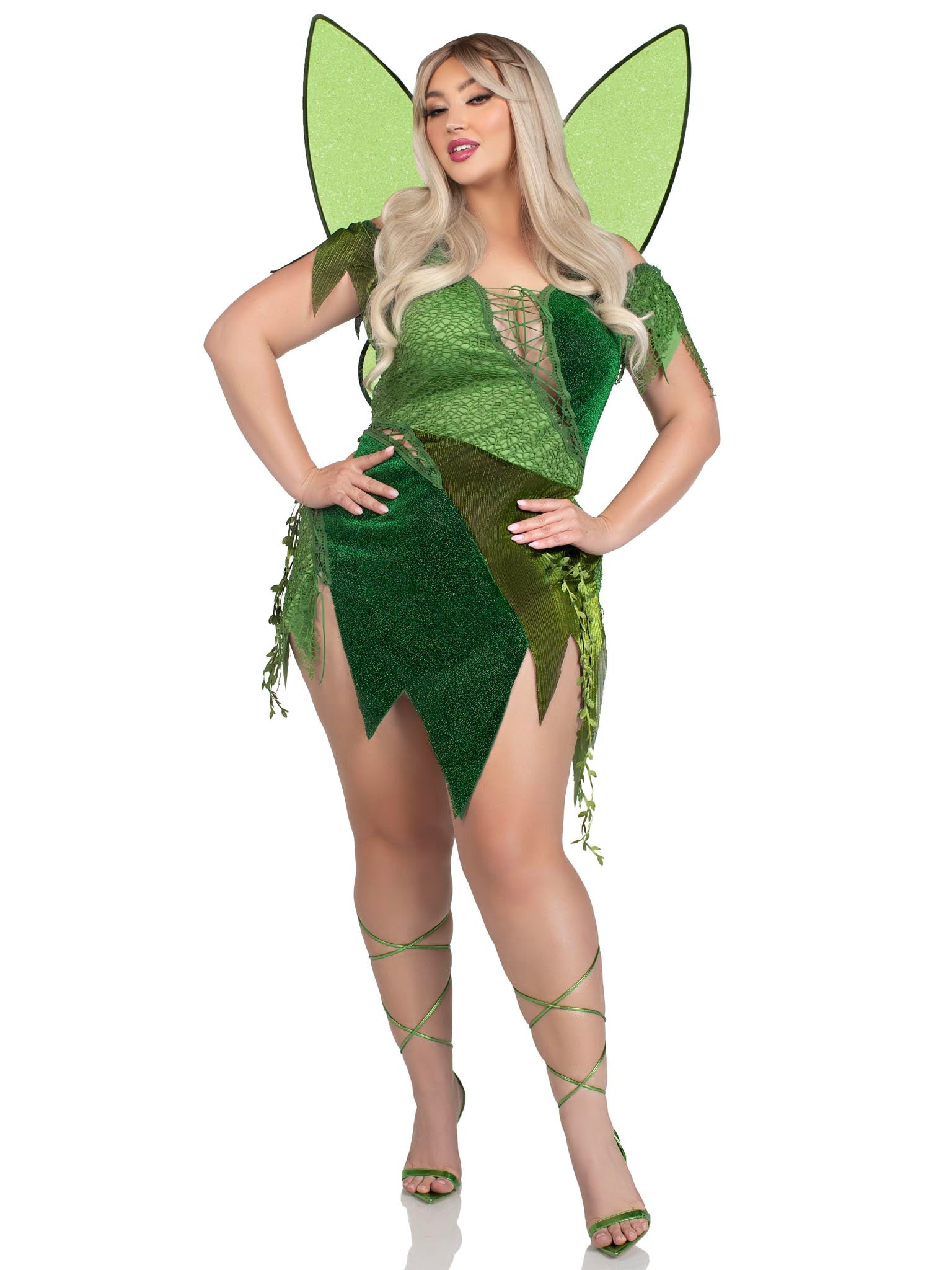 Step into the world of enchantment with the 3 PC Forest Fairy costume by Leg Avenue. This whimsical plus size Halloween costume includes a patchwork dress with adjustable lace ups and tattered skirt, leaf accents, detachable clear straps, and shimmer fairy wings. The daring design and unique details of this sexy costume are simply magical.