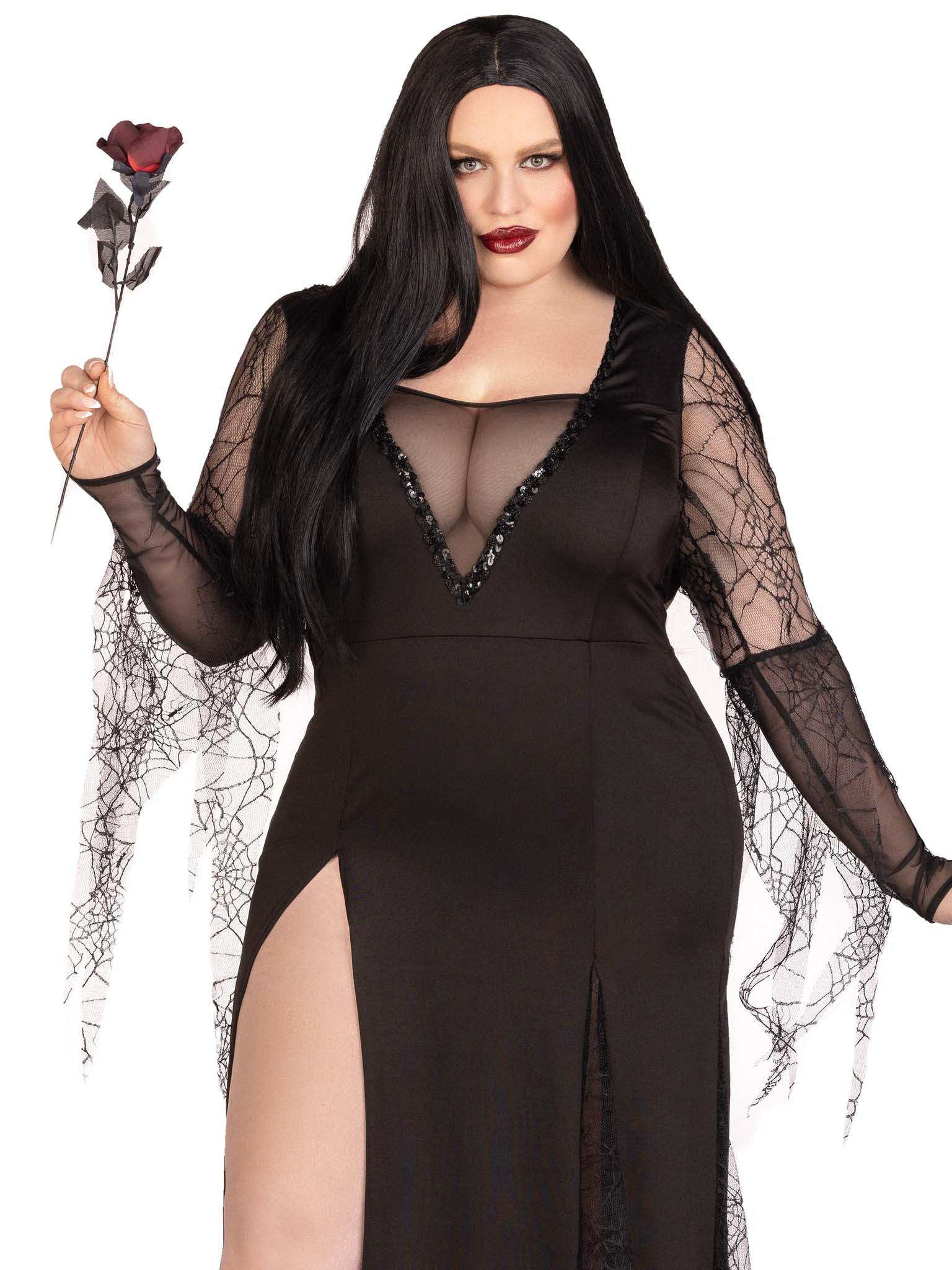This divine diva needs no introduction. Finger snaps for the Spooky Beauty plus size Halloween costume by Leg Avenue. A dress superbly fit for the queen of darkness, this sexy costume look features a backless deep-v dress with sequin trim and ruched back, spiderweb gauntlet sleeves, and high slit tentacle skirt. Find your cara mia for the ultimate couples costume.
