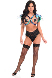 Teal Blue Holographic Fringe Body Harness for Dance or Costume