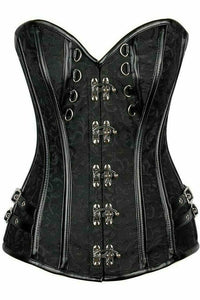 - Overbust corset made of premium faux leather and brocade fabrics and hardware