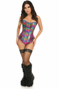 Top Drawer Rainbow Glitter PVC & Black Fishnet Steel Boned Over Bust Corset
